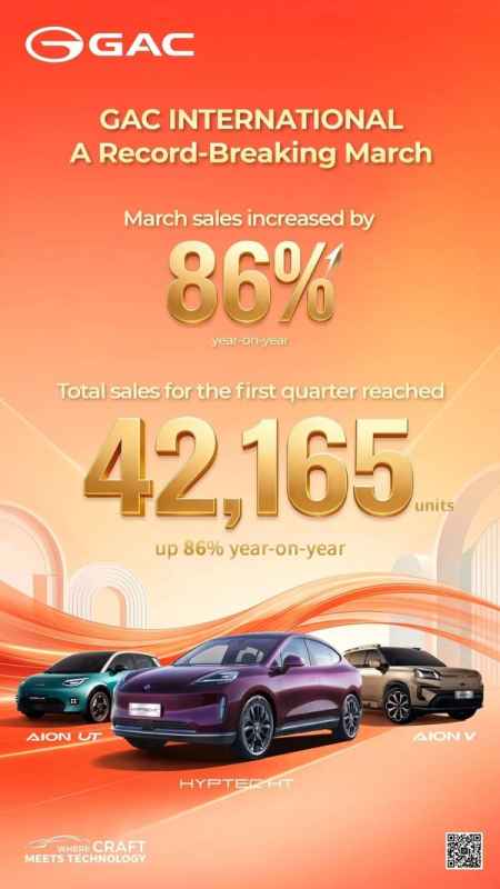 GUANGZHOU, China, April 3, 2026 /PRNewswire/ -- GAC continued its strong overseas momentum in March, with monthly sales of its own brands reaching 17,031 units. First-quarter cumulative sales hit 42,165 units, up 86% year-on-year. Driven by the "One GAC 2.0" strategy and "Tech-Driven GAC, Advancing Global Reach with a Full-Chain Ecosystem" theme, GAC is accelerating its shift from product exports to global operations.