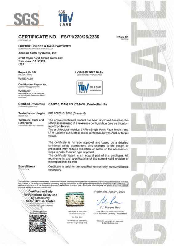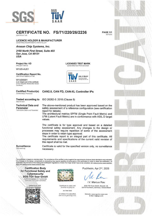 SAN JOSE, Calif., Apr. 21, 2026 /PRNewswire/ -- Arasan Chip Systems, the industry's leading provider of IP for Mobile and Automobile SoC's, announced today that its CAN XL IP has achieved the ASIL-D Certification. The CAN XL IP has been independently certified by SGS-TÜV Saar as ASIL-D, the highest safety level of functional safety defined in ISO 26262, the international standard for functional safety in road vehicles.