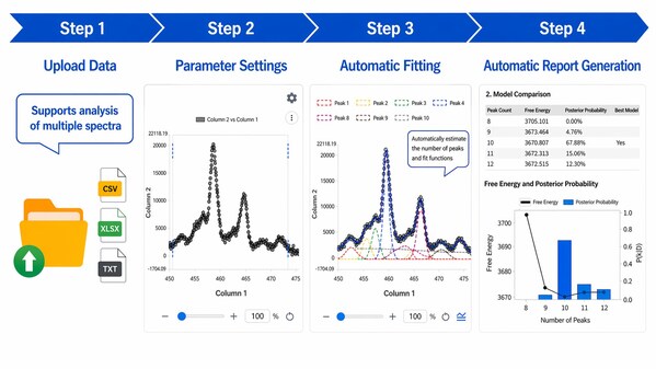AutoStatSpectra compares candidate models within a user-specified range and automatically selects the optimal number of peaks based on posterior probability. In addition to estimating parameters such as the height, center position, and full width at half maximum (FWHM) of each peak, it also automatically determines the most suitable peak function type for the data, including Gaussian, Lorentzian, and pseudo-Voigt functions. Because uncertainty in each estimate can also be evaluated quantitatively, the software enables highly reproducible peak fitting with less reliance on analyst experience and trial and error.